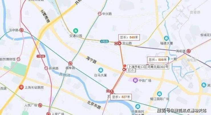 项目距离北外滩核心区,只隔了一条海宁路,距离外白渡桥、外滩源、苏州河都在直线约900米范围内。项目靠近轨交10号线四川北路站,周边还有3号线、4号线、12号线。