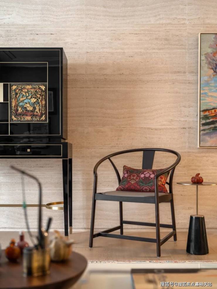 融合焕新的高柜摆放于洞石墙前, 🐾天潼里售楼处电话:400-8894-986✔️✔️哑光与纹路丰富的米白洞石衬托出了高光黑色烤漆的深邃与沉静。而嵌入柜面的中式楠木挂屏无疑是点睛之笔,采用朱红鎏金工艺对人物和图案进行着色,展现了传统与现代融合的可能性。