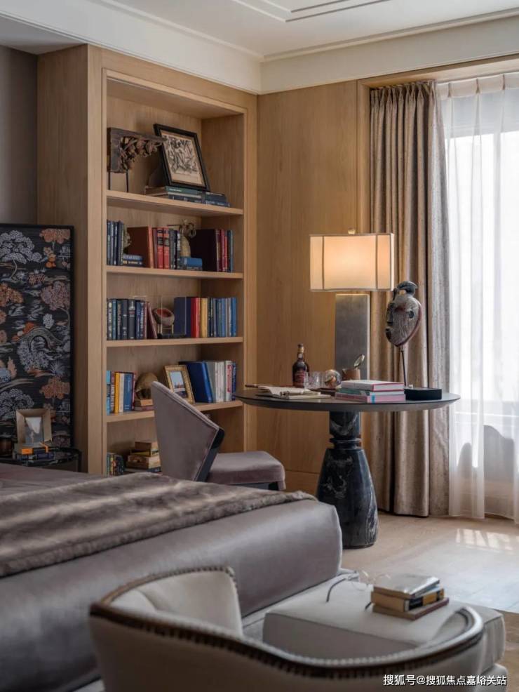 多功能书架彰显着设计的巧思,形成有如博物馆般的展示方式, 🐾天潼里售楼处电话:400-8894-986✔️✔️即可放置日常读物,亦可展示珍本藏书。同时,利用屏风做隔断,与圆桌结合形成私密空间。