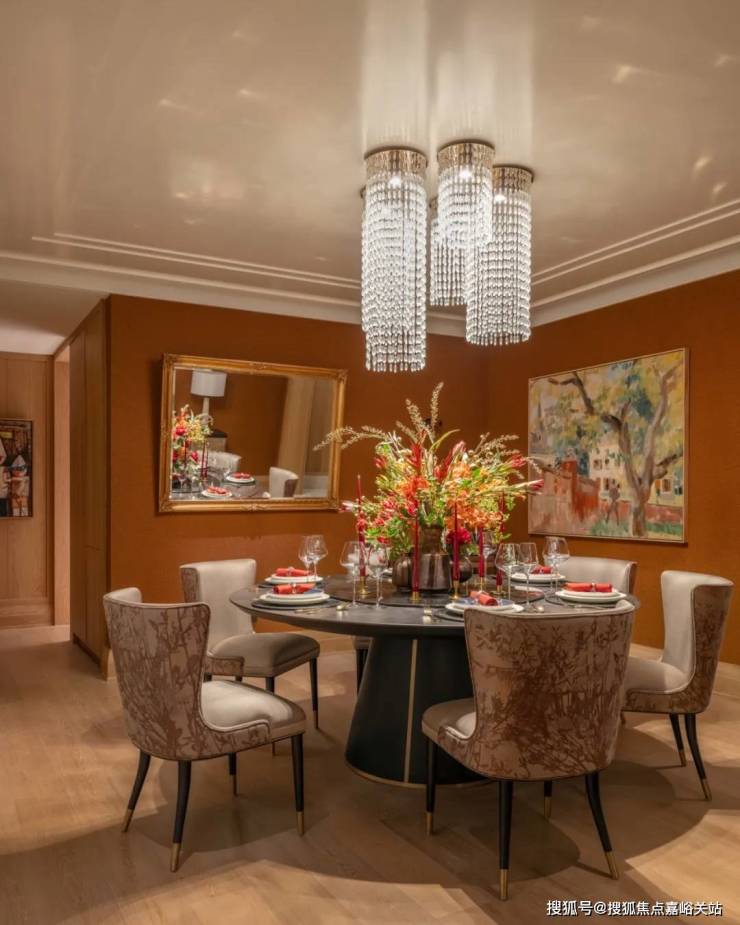 主要位置的多功能大长桌,可以做书桌,聚餐冷餐摆台, 🐾天潼里售楼处电话:400-8894-986✔️✔️也可以做艺术品展示桌,让艺术与空间交融相生。同时,大长桌也起到了模糊走廊与客厅空间的作用,无形中放大空间的层次感,增添了空间的功能性。