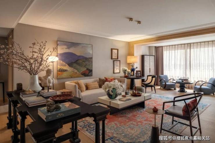 正式的大沙发区域,灵活散座区域,家具注重收藏种类多样性, 🐾天潼里售楼处电话:400-8894-986✔️✔️中式圈椅,西式小沙发,灵活移动,根据需求可聚可散。手工编织的复古羊毛波斯地毯,用植物和矿物天然染料来进行染色,拥有了抗衡时间侵蚀的美,更增加了收藏的丰富性,是高品味的体现。 🐾天潼里售楼处电话:400-8894-986✔️✔️