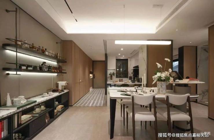 其中,餐厨系统的进阶不只在于橱柜、拉篮等细节的收纳,更在于映江润府引入了创新的S墙。可以轻松将冰箱移出厨房,同时保证视觉效果的整体性。实现了为厨房预留更多空间的同时,将冰箱从食材的物理储存空间,变成了相聚待客的精神愉悦空间,一杯“快乐水”,不过是触手可及的距离,幸福感大大提升。