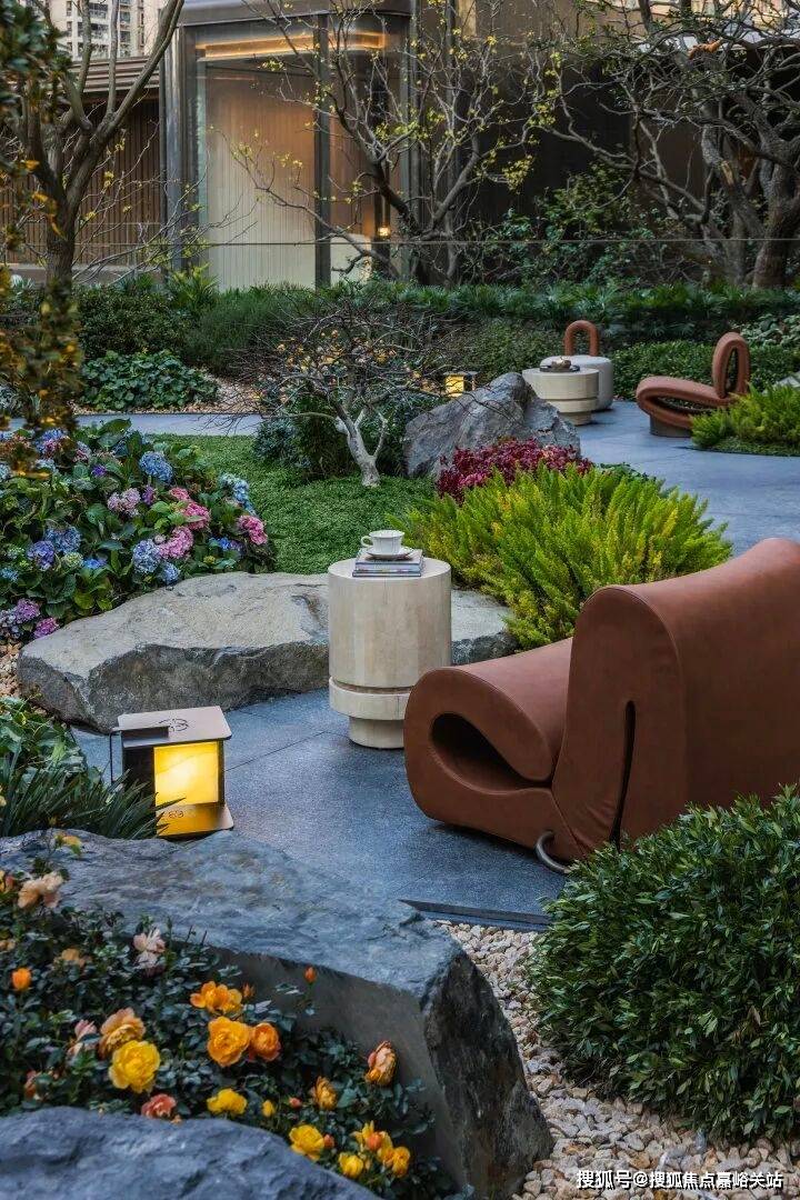社区内更打造独属于女主人的 望园小聚 下午茶花园,绣球、紫薇、桂花、石榴等绿植相映成趣,四季皆有景致,牛油果绿与贝金米黄奢石围合出柔软的休憩角落,成为闺蜜相聚、私享时光的温馨天地;