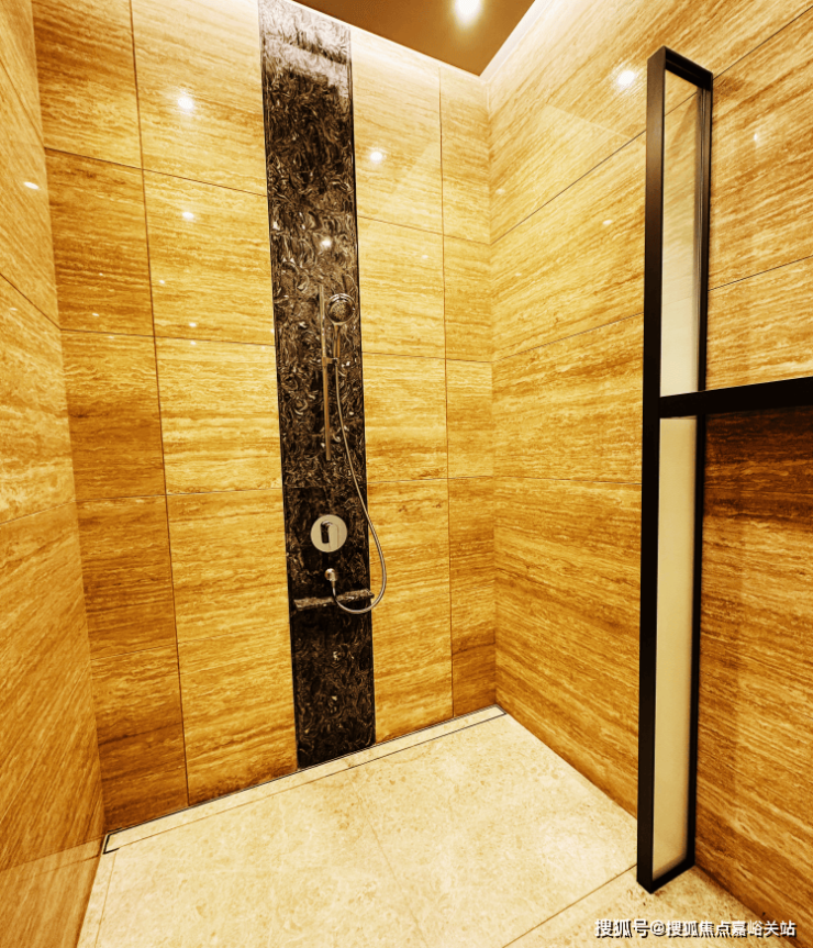 再来看看人行入户大堂,挑高的精装大堂搭配宝华标志性的太阳花装饰,连天花板都嵌入了星空灯光,整个大堂仿若拥有了星级酒店的落客体验。