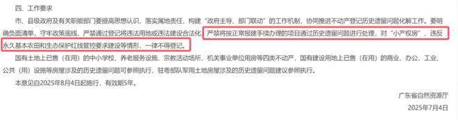 而过去《广东省自然资源厅关于印发加快处理不动产登记历史遗留问题指导意见的通知》(粤自然资规字〔2018〕5号)只针对“不符合法律法规规定的小产权房”,但新的指导意见,将严禁的问题放在了“工作要求”的部分。