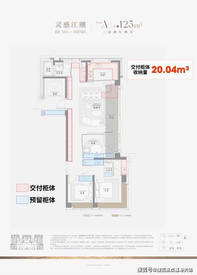 据小胖君手工统计,项目125㎡3房边套户型的整体交付柜子+预留衣柜,收纳空间可以达到约20.04m³,中间套户型也能达到约16.56m³!