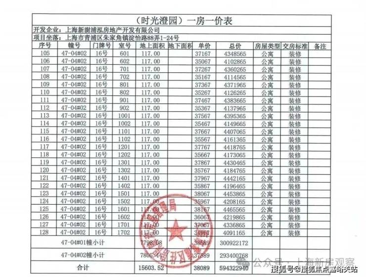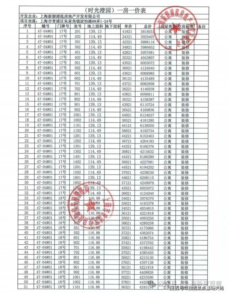 上期一房一价表如下: