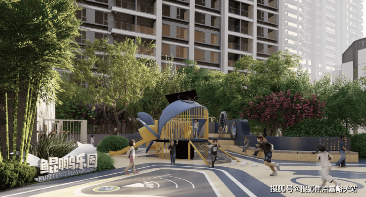 以 “鲲鹏乐园” 主题儿童乐园、鲲鹏书院、老人颐乐空间、多元艺术花园、约760m“汽车文化”主题跑道、森林漫步道等共享场域为居者构筑一个有温度的社区。