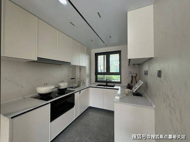 厨房是带岛台交付的U型厨房,厨具品牌为西门子四件套,另外还有双开门冰箱,线性凉霸、科勒单槽。