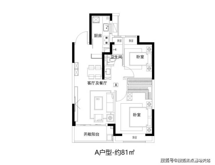 建面约81㎡2房功能齐全,拥有朝南大面宽和全卧飘窗设计。
