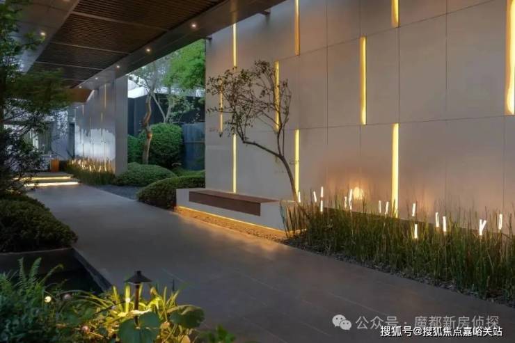 各式各样的艺术景墙映入眼帘,辅以仪式感排布的弯杆铁冬青树阵,树植掩映之间,呈现一幅热情且不喧闹的迎宾之姿,消弭城市喧嚣,礼遇进出的每一步。