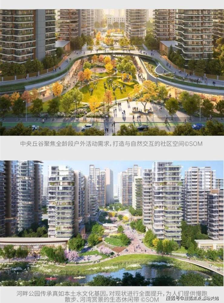 规划以“悦”、“赏”、“游”、“聚”四大主题为脉络,相应打造了仓廪市集,中央丘谷,河畔公园和桥水门户四大场所,并通过贯串全域的社区漫步景观带,将这些高品质公共空间有机串联起来,打造成为城绿共生、全龄友好、活力精致的大型高品质社区。