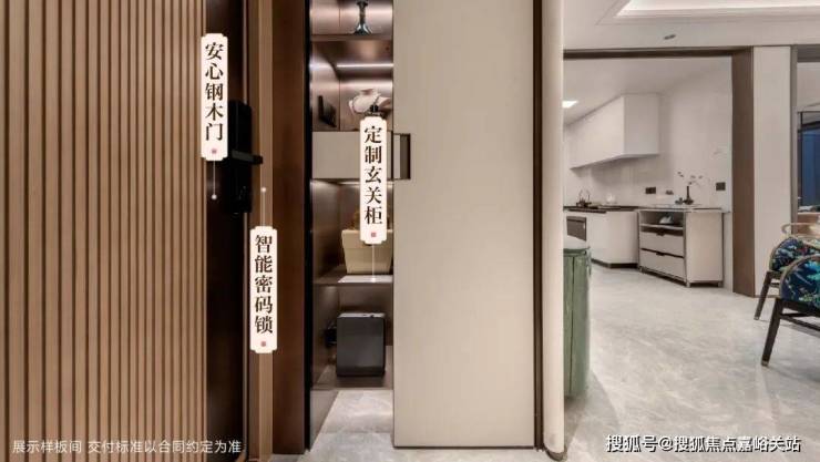 入户门选用钢木复合防盗门 ,坚固耐用,防火、保温亦可隔声, 搭配智能密码锁,多重开启功能,贴心守护居家安全。 定制玄关柜,巧妙集合收纳、置物等功能,缔造从容生活体验。