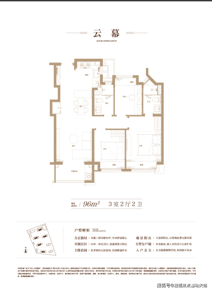 建面约96㎡,充分从居住者的角度考量生活动线、舒适度与生活感。 S型的分户墙,褪去呆板,为家具预留更多的空间; LDK一体化的设计打破空间局限,解锁更多的生活场景,也拉近家人间的距离;主卧套间自在独处,生活的优雅时刻尽显……