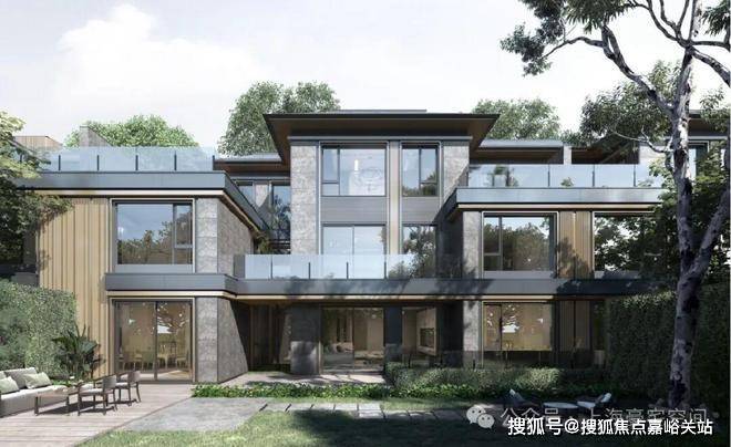 项目由5幢4层平层公寓、5幢3层别墅及1幢保障房组成。平层公寓45套,面积为170-350㎡,别墅23套,地上面积400㎡-690㎡。经典三段式别墅立面及大窗墙比,实现居住与自然的延伸;中灰色石材为基座,奢石宁静与土地矜贵互为映衬。中灰色石材的厚重感,深灰色铝板的舒展度,“安缦金”高奢质感勾勒边框,与蓝眼睛光面石砖、冰花蓝光面石材的交织下,呈现出“天光云影”的意境。