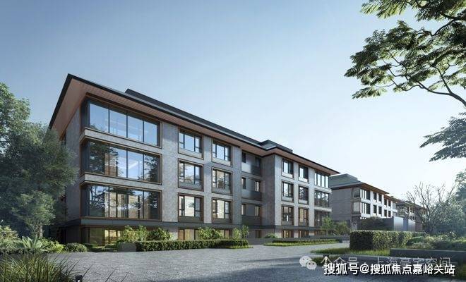 建筑风格:新中式建筑风格,外立面选用干挂石材搭配仿木格栅,线条简洁大气。