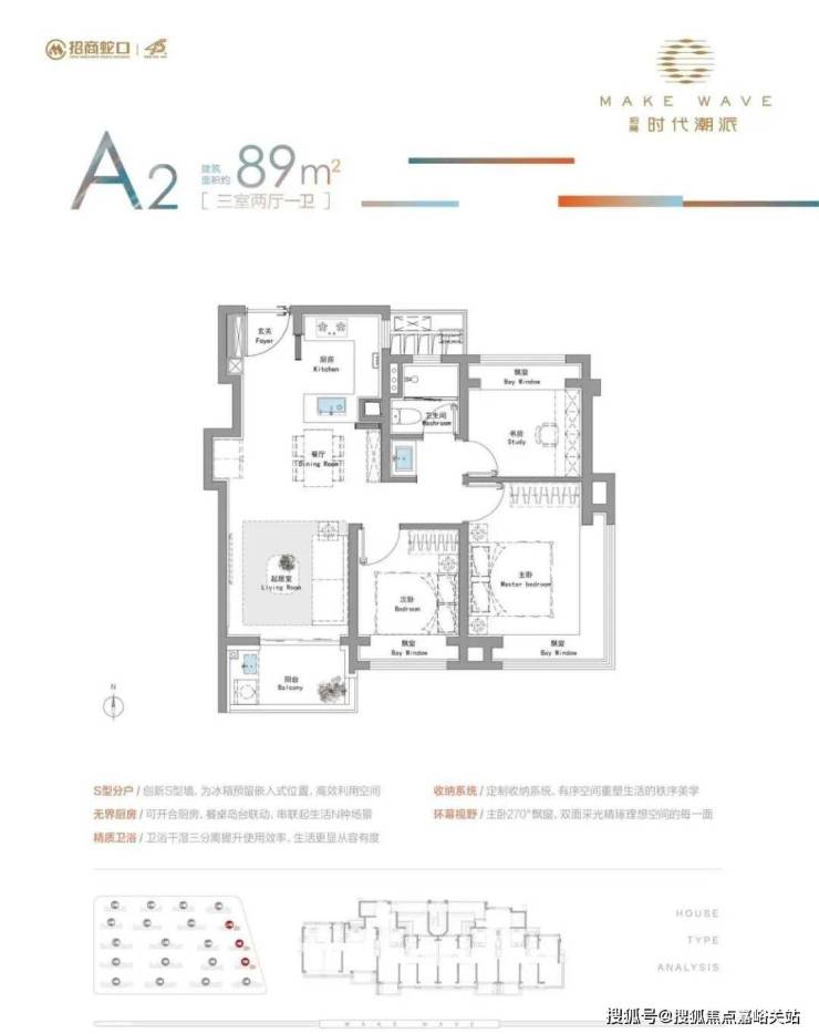 建面约89㎡3房户型:东边套主卧配置约270°双向采光飘窗、S墙设计,主力总价仅约450万级,首付约90万起!☑️☑️招商时代潮派售楼处电话:400-1183-605☑️☑️