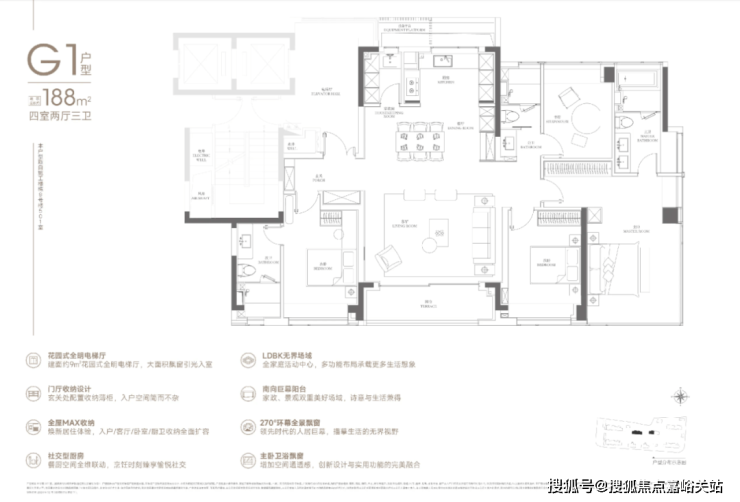 188户型2梯2户,有独立的电梯厅。4房3卫设计,还是3明卫,这两点还是不错的。