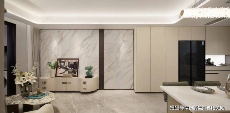 值得一提的是,入户玄关设置一整面的玄关柜空间,左侧分户墙处增设“凹型空间", 预留内嵌双开门冰箱空间。