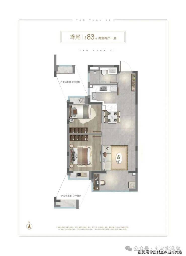 83㎡2房作为市场罕见的“入门级豪宅”,装修标准高达约4000元/㎡ ,客餐厅一体化设计搭配通阳台,空间利用率拉满,两卧均带飘窗;