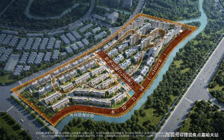 横轴—约1.5公里水岸公园,借景河道横穿自然三景