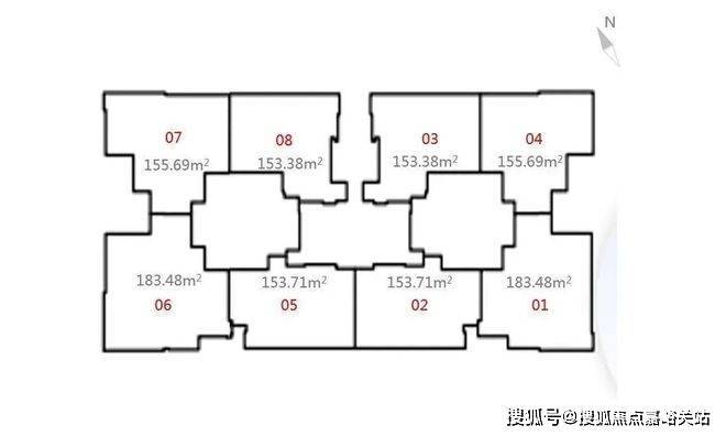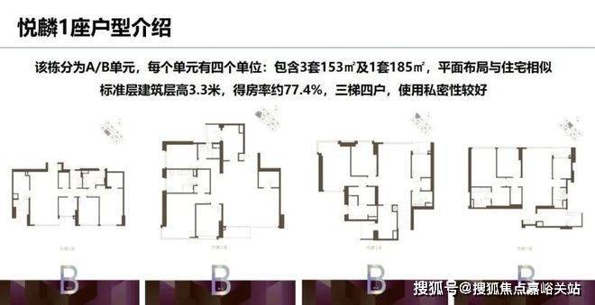1.TODTOWN天荟 | 悦麟分为两个单元,每个单元三梯四户,主力户型为建面约153~185㎡行政公馆,层高约3.3米,得房率高达约77%,这点非常难得!