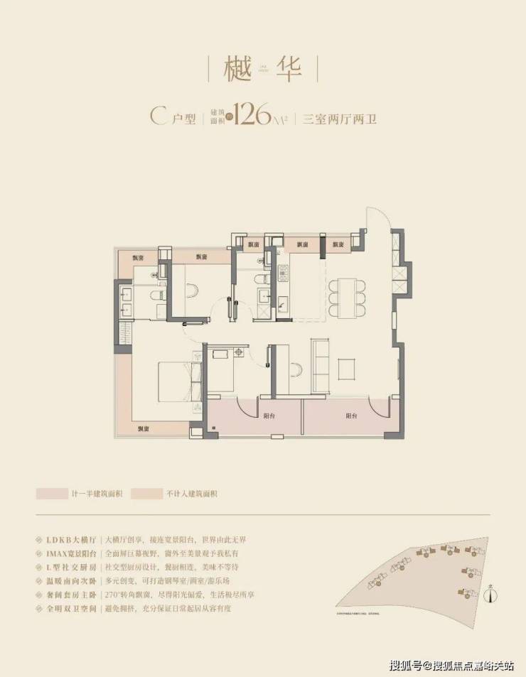 建面约106㎡的三房两厅两卫,3.5开间朝南,南向面宽达到约11.8m!碾压市面上以前的三开间朝南、10米面宽的三房户型。