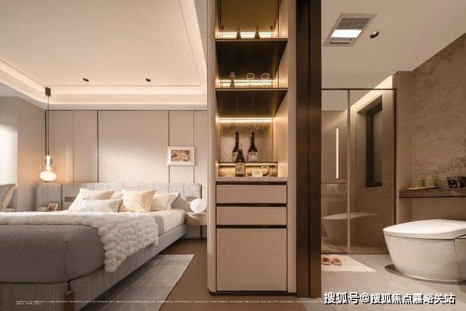 南向双卧全明通透,主卧奢享升级套房设计,门口预留次净衣区,衔接独立卫浴,搭配整墙定制衣柜与双柜布局,最大化收纳潜能;