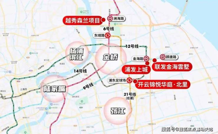 步行约350米可达14号线与在建21号线换乘站浦东足球场站,是四个项目中地段最好、轨交距离最近、线路能级最高的。