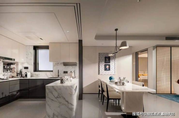 开放式厨房+岛台设计空间更通透转角抽屉收纳、下拉栏顶部设计反光镜避免视觉死角、轨道插座置于岛台侧墙不占台面空间等等,众多收纳细节思量到位,匠心独运!