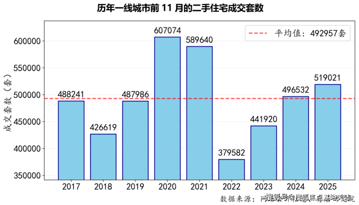 根据报告,截至11月,四个一线城市全年二手住宅累计成交519021套,不仅超越2024年同期的496532套,同比增长约5%,更是近四年来首次突破51万套大关,达到近9年的第三高水平,仅次于2020和2021年。