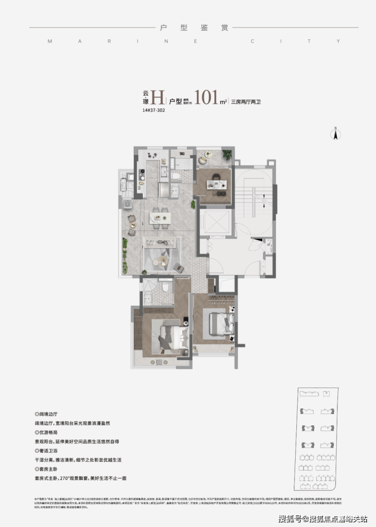 部分建面约100-101㎡H边厅户型,全景阳台搭配主卧L型转角大飘窗,三面采光+270°环幕视野,景观面堪比市区滨江顶豪,白天远眺松江人文,晚上看脚下星火流淌,十分惬意。