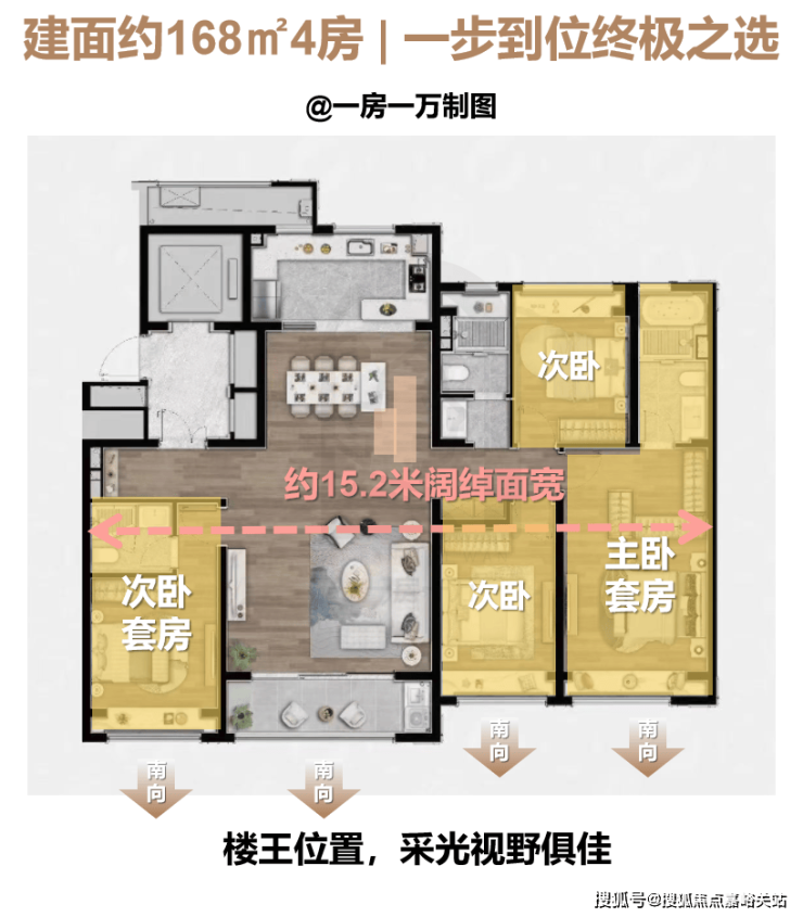 建面约168㎡户型,更是整个板块乃至板块内都非常稀缺的改善大户型,而且还坐拥 社区楼王位置 ,观景视野极佳。