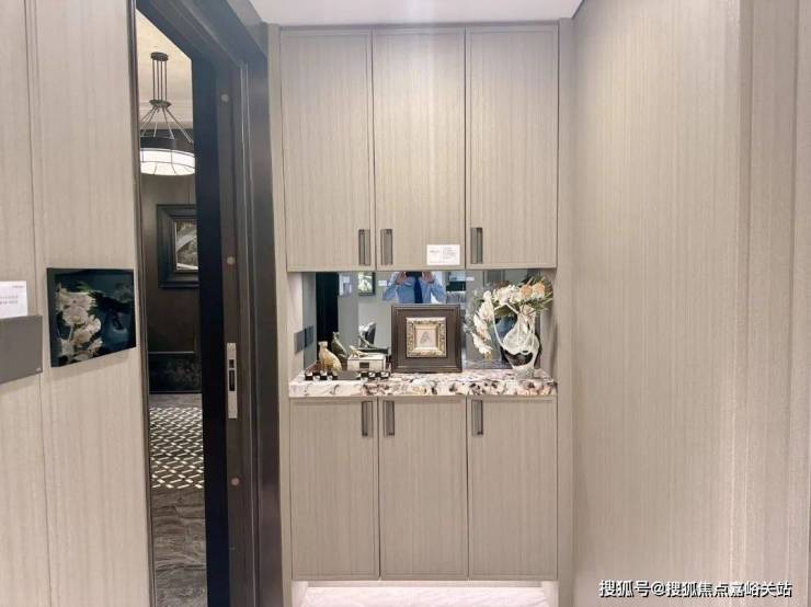 餐厅区域放置一个餐边柜,同样选用了雪山飞狐奢石做透光台面设计,「越秀杨浦天玥」售楼处电话:400-8377-020(欢迎致电)餐边柜在收纳储物方面具有显著作用。