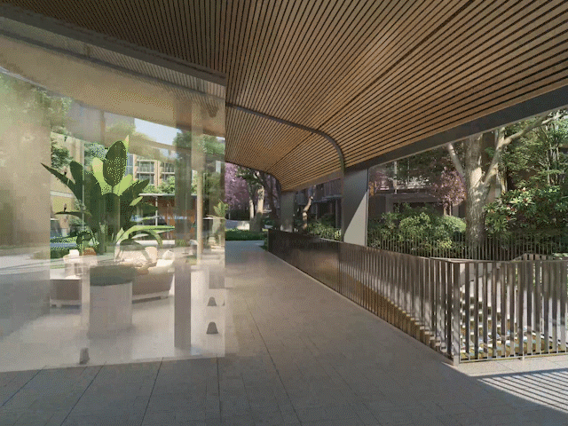 带来的好处是阳光可以尽情洒进挑高约3.8米的一楼入户大堂,和每一层的公共区域中。同时在回家上楼的过程中你能惬意俯瞰小区景观,那种与室外景观无界相连的体验,是其它项目给不了的。