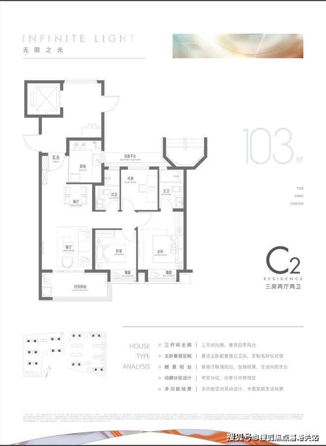 建面约95m²户型特点:开放式厨房,极度释放厨房与客厅的尺度与互动可能,无连廊设计,一梯两户极致梯户比,南北通透舒适感
