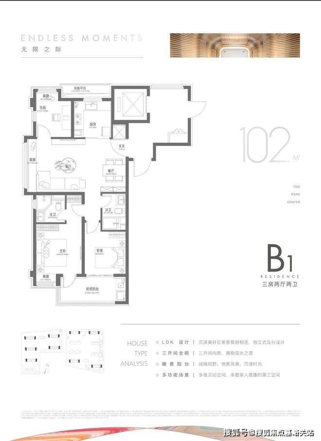 建面约102m²户型特点:LDK洄游式景观边厅,景致拉满,3+X陪伴空间,承载更多自定义功能需求,开放式厨房,烹饪与客餐厅无界互动。