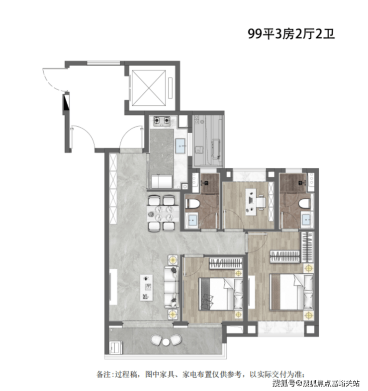 建面约99㎡3室2厅2卫户型,做到了 三开间朝南+超大阳台+动静分离+主卧套房设计,延伸了室内实际可使用面积,采光、通透性都非常不错。
