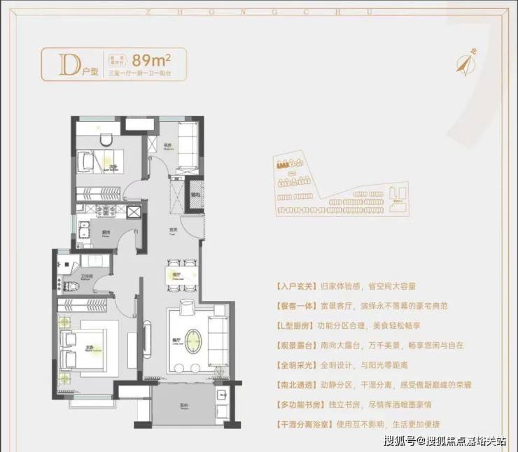 洋房总高8层,建筑面积约55-89㎡1-3房,精装交付,共计176套,有4个主力户型,包括建面约55、56㎡1房,78㎡2房,89㎡3房。