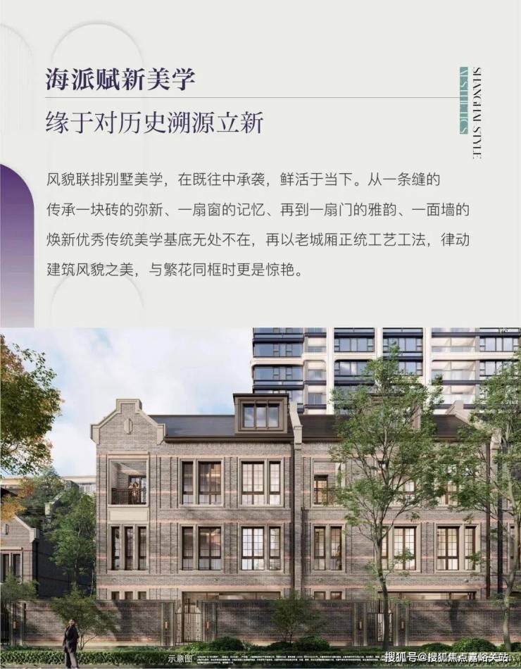 风貌别墅延续了上海 石库门风格 。 青砖黛瓦,红色腰线,南向面宽最大的大概约15米左右。从一扇门、一扇窗中保留和创新,同时区别“里弄式”别墅的小格局、少采光、多浪费 ;空间布局灵活,满足不同高阶家庭生活需求,递呈出静安苏河畔难得的海派浓荫别墅。