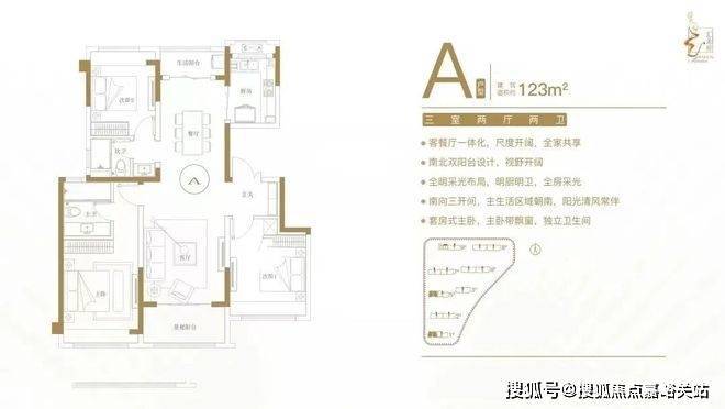 建面约123㎡三室两厅两卫户型特点:客餐厅一体化,尺度开阔,全家共享;南北双阳台设计,视野开阔;全明采光布局,明厨明卫,全房采光;南向三开间,主生活区域朝南,阳光清风常伴;套房式主卧,主卧带飘窗,独立卫生间。