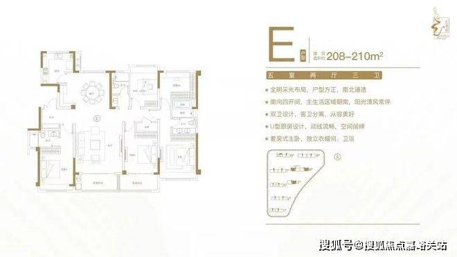 佳运汇龙府售楼处电话4008569058☑️☑️建面约 208-210㎡五室两厅三卫户型特点:全明采光布局,户型方正,南北通透;南向四开间,主生活区域朝南,阳光清风常伴;双卫设计,客卫分离,从容美好;U型厨房设计,动线流畅,空间阔绰;套房式主卧,独立衣帽间、卫浴。佳运汇龙府售楼处电话4008569058☑️☑️