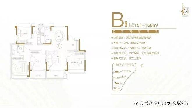 佳运汇龙府售楼处电话4008569058☑️☑️建面约 151-158㎡四室两厅两卫户型特点:空间灵活,满足不同家庭阶段需求;客餐厅一体化,增大实用面积;双阳台设计,全明采光,通透舒适;南向四开间,户户飘窗,采光通风性俱佳;套房式主卧,独立卫生间。佳运汇龙府售楼处电话4008569058☑️☑️