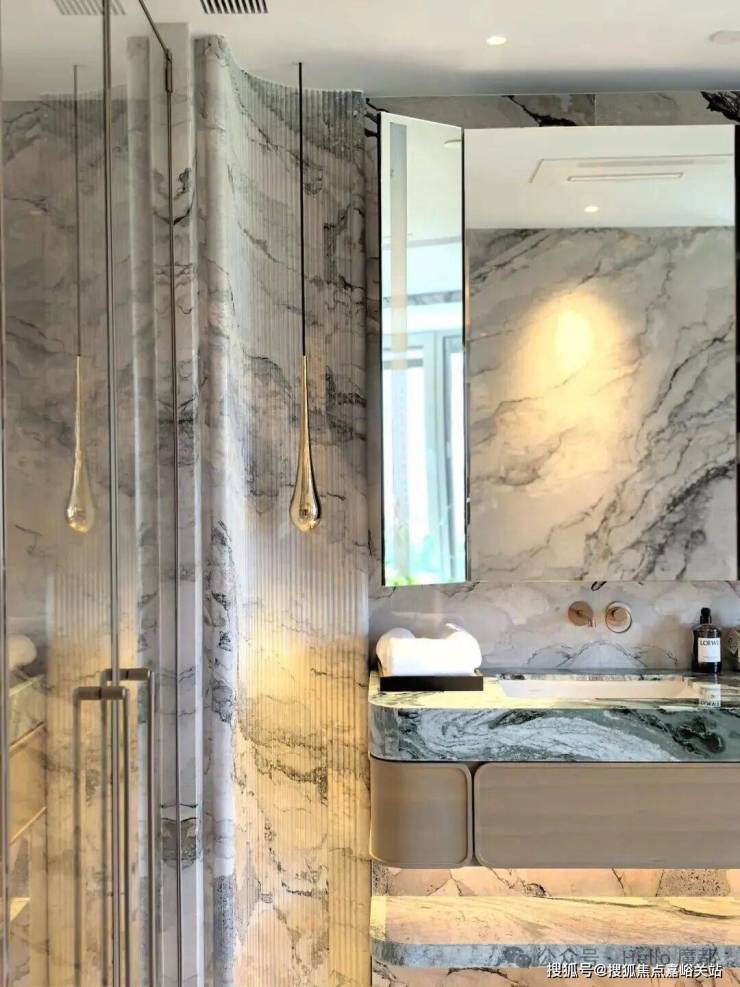 其中,上海首个植物园泳池以皮革面绿色石材营造树影斑驳的秘境氛围: