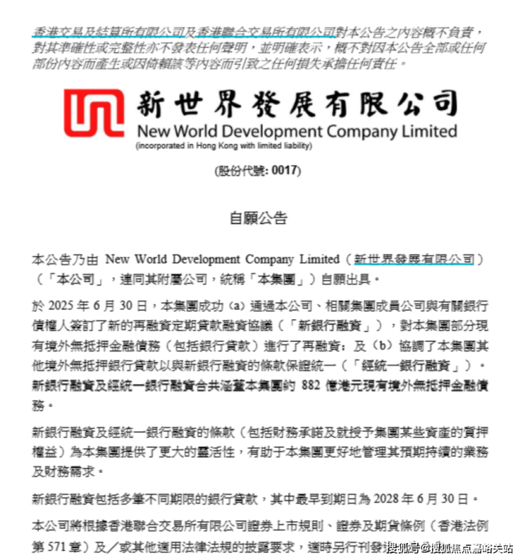 6月30日,新世界发展宣布,集团(新世界发展连同其附属公司)成功通过本公司、相关集团成员公司与有关银行债权人签订了新的再融资定期贷款融资协议(下称“新银行融资”),对集团部分现有境外无抵押金融债务(包括银行贷款)进行了再融资;并协调了集团其他境外无抵押银行贷款以与新银行融资的条款保证统一(下称“经统一银行融资协议”)。