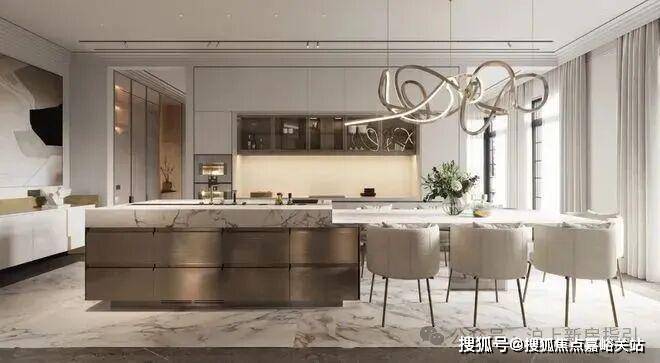 未来港元启售楼处电话:4008569058在厨房的设计中依然沿袭客厅的设计采用大理石元素,通过金属元素与大理石元素的结合来表现空间的轻奢,其中金属的岛台加上大理石台面让空间极具氛围感,让空间看上去更有层次。未来港元启售楼处电话:4008569058