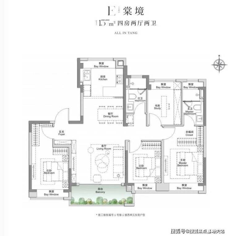 建面约117㎡3房2厅2卫,做到了 3+1开间朝南+5个飘窗+主卧套房设计+270°转角飘窗,所有的尺度都有进一步提升。