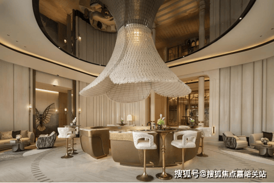 会客厅不仅承载了“私人空间之外的延伸场景”,还打造了标志性的 “羽化万象”艺术吊饰,每一片玻璃羽毛造型都由经验颇丰的老师傅搭建而成,构建出光影婆娑的美学画卷。