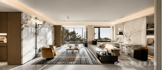 室内空间:引入了全屋智能家居系统 ,能通过App、中控、语音三大方式,调节全屋智能家居,包括客厅灯光、空调、地暖、新风、客厅和主卧窗帘等场景。