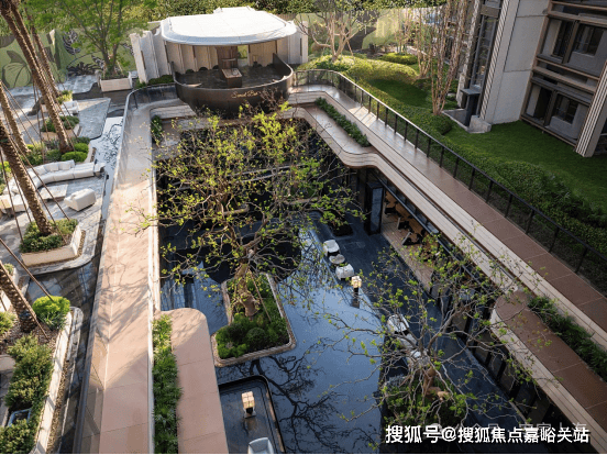 实景呈现的岛屿水院,作为保利天奕五座全球大师花园之一,在 银海枣树阵、下沉式庭院、镜面池畔卡座的呼应中,成为未来居者沉浸自然的惬意之地。温柔闲适的 落日廊吧,犹如身处海岛之畔,感受蓝调时刻的优雅情调。